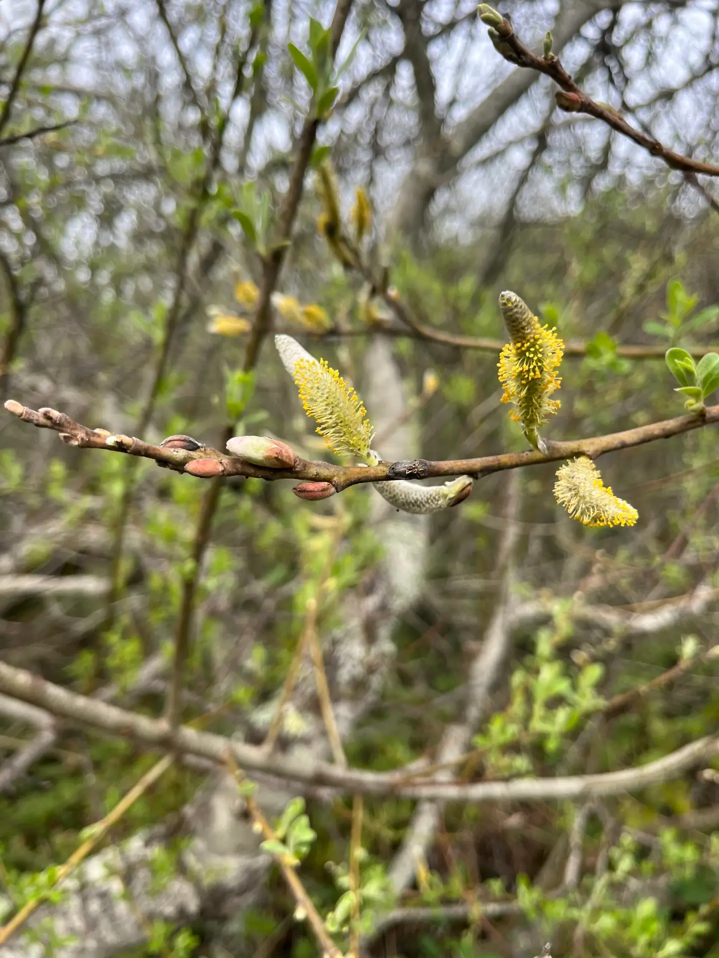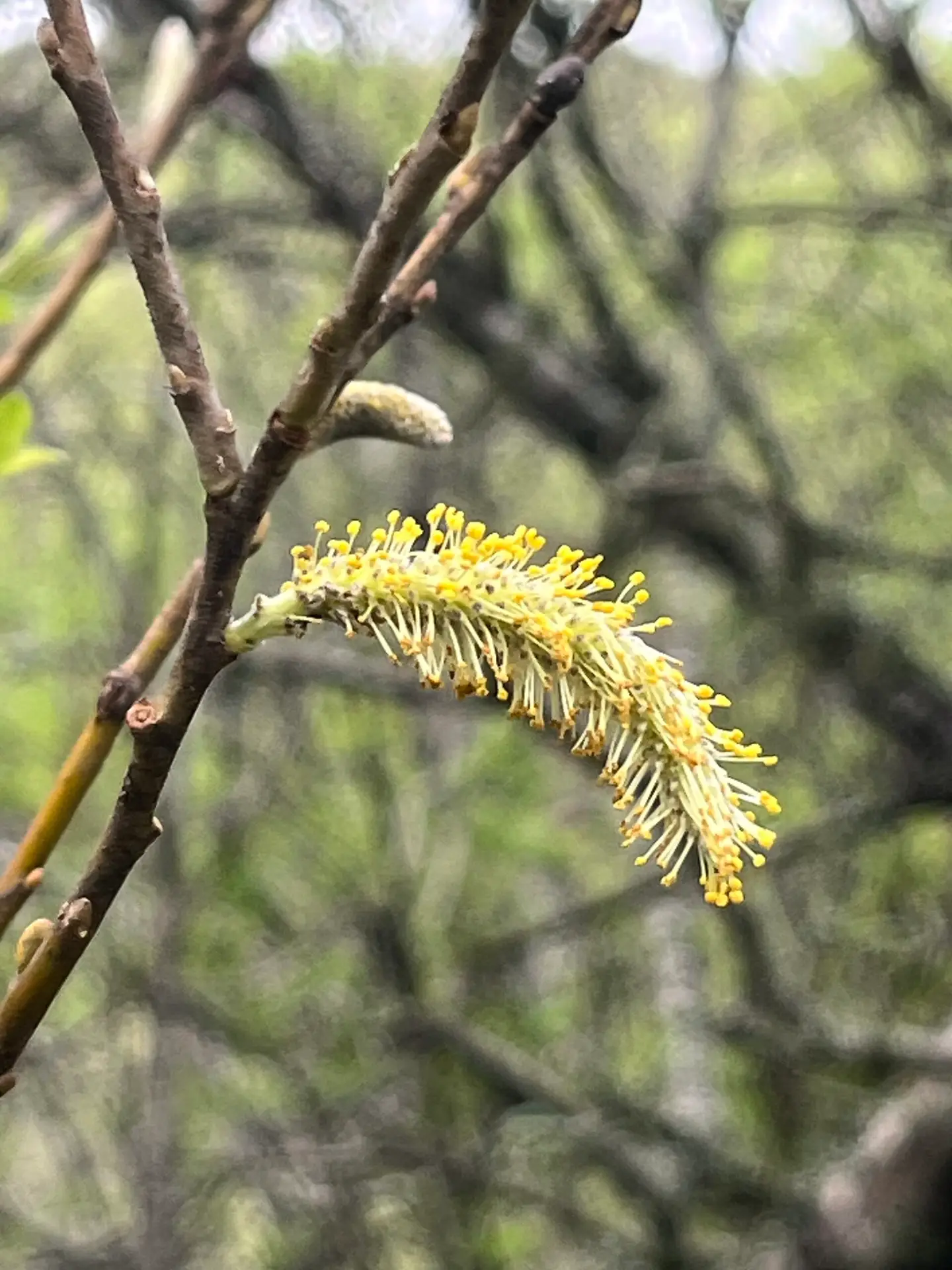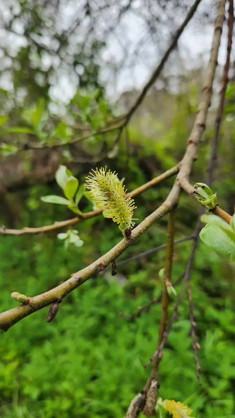 Male catkins and female catkins appear on separate plants (dioecious). Male catkins are yellow, female catkins are smaller and green. Flowers have no sepals and no petals. Catkins appear before leaves.