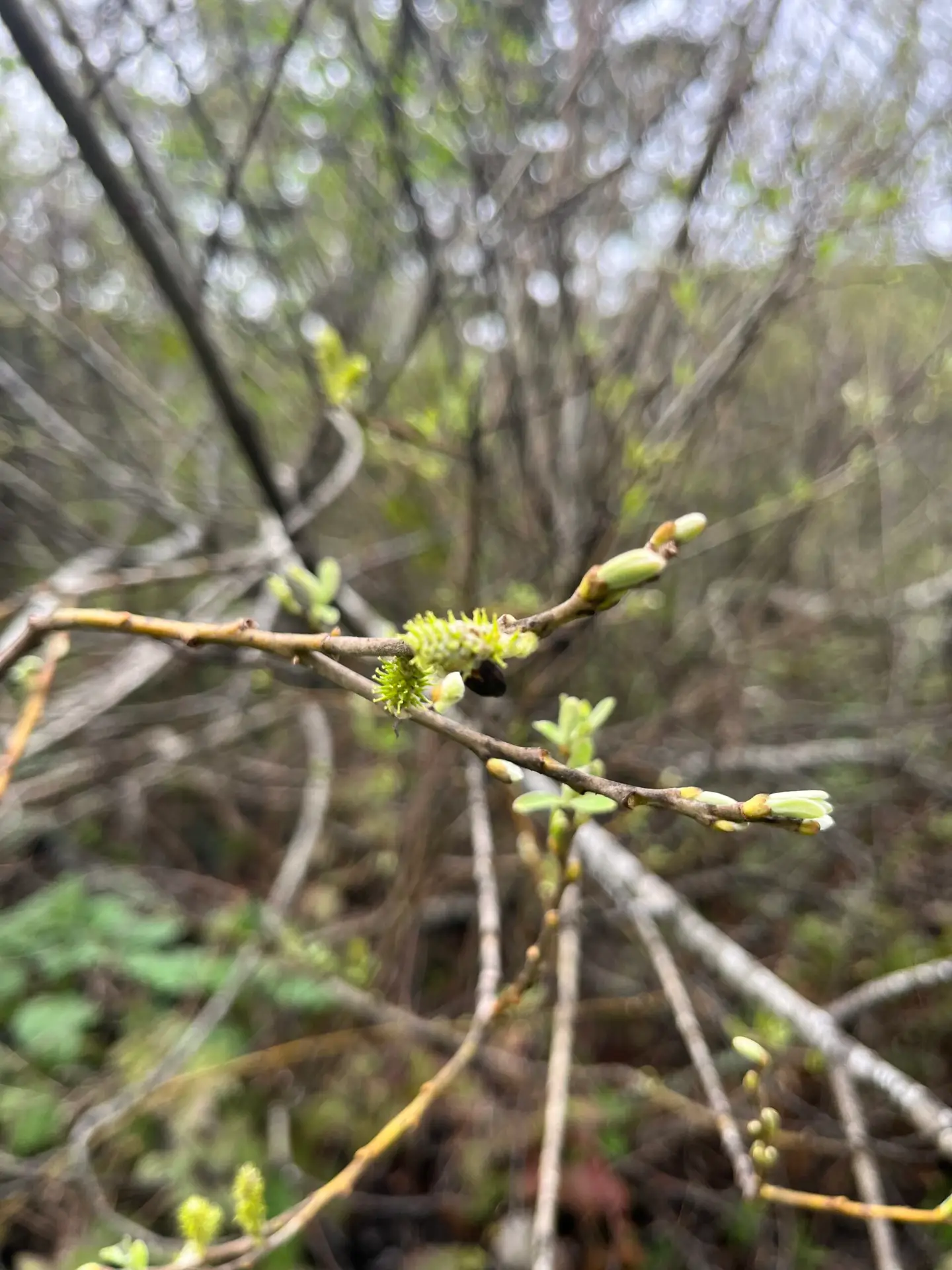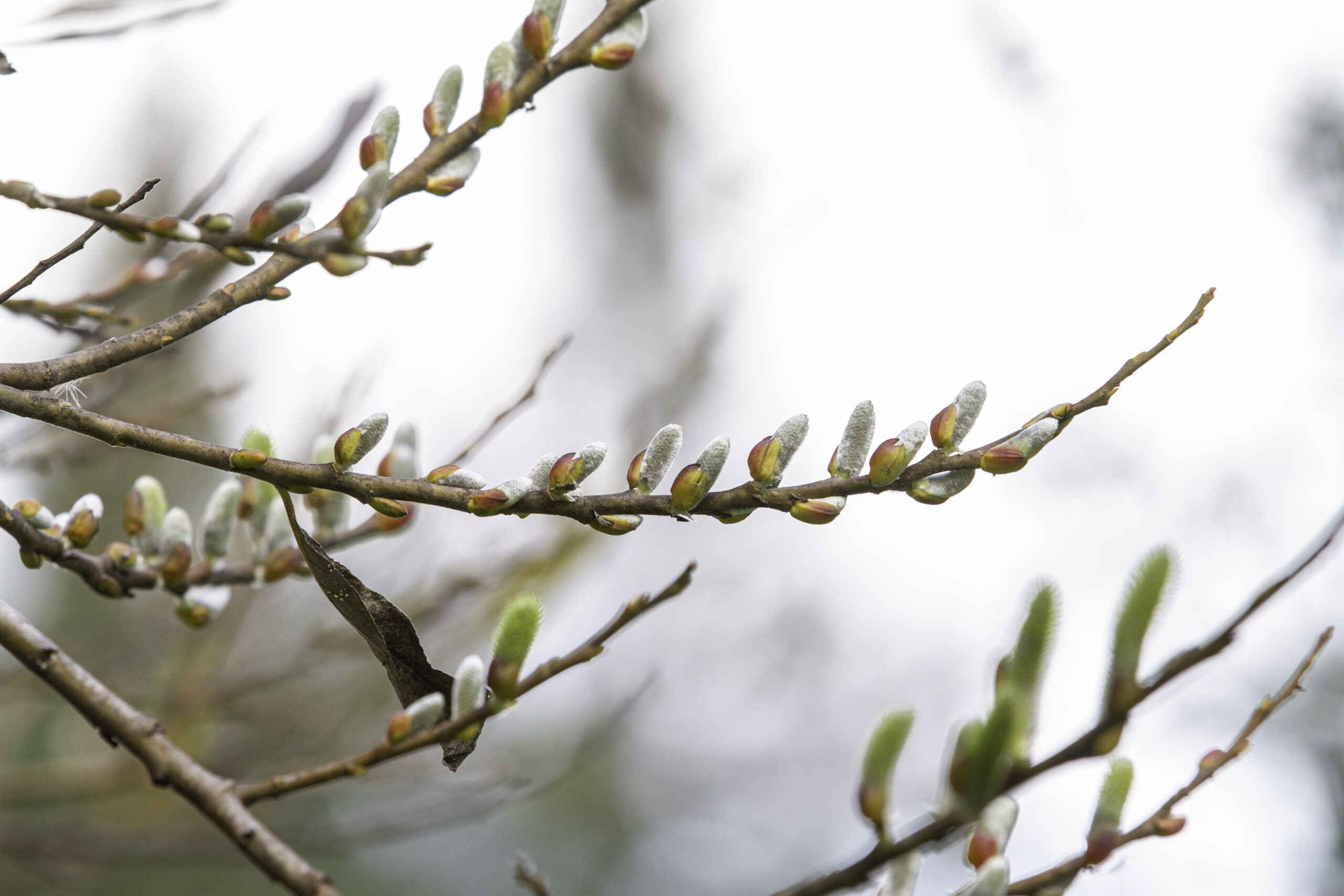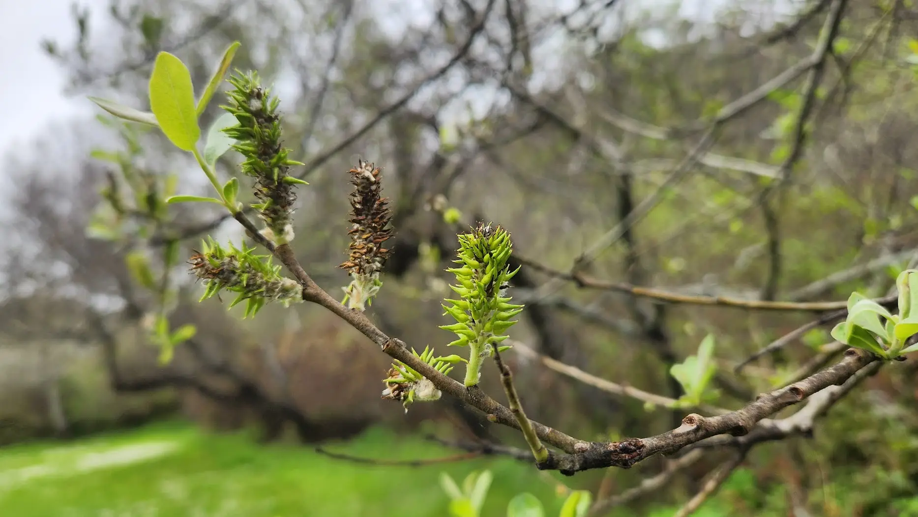 Male catkins and female catkins appear on separate plants (dioecious). Male catkins are yellow, female catkins are smaller and green. Flowers have no sepals and no petals. Catkins appear before leaves.