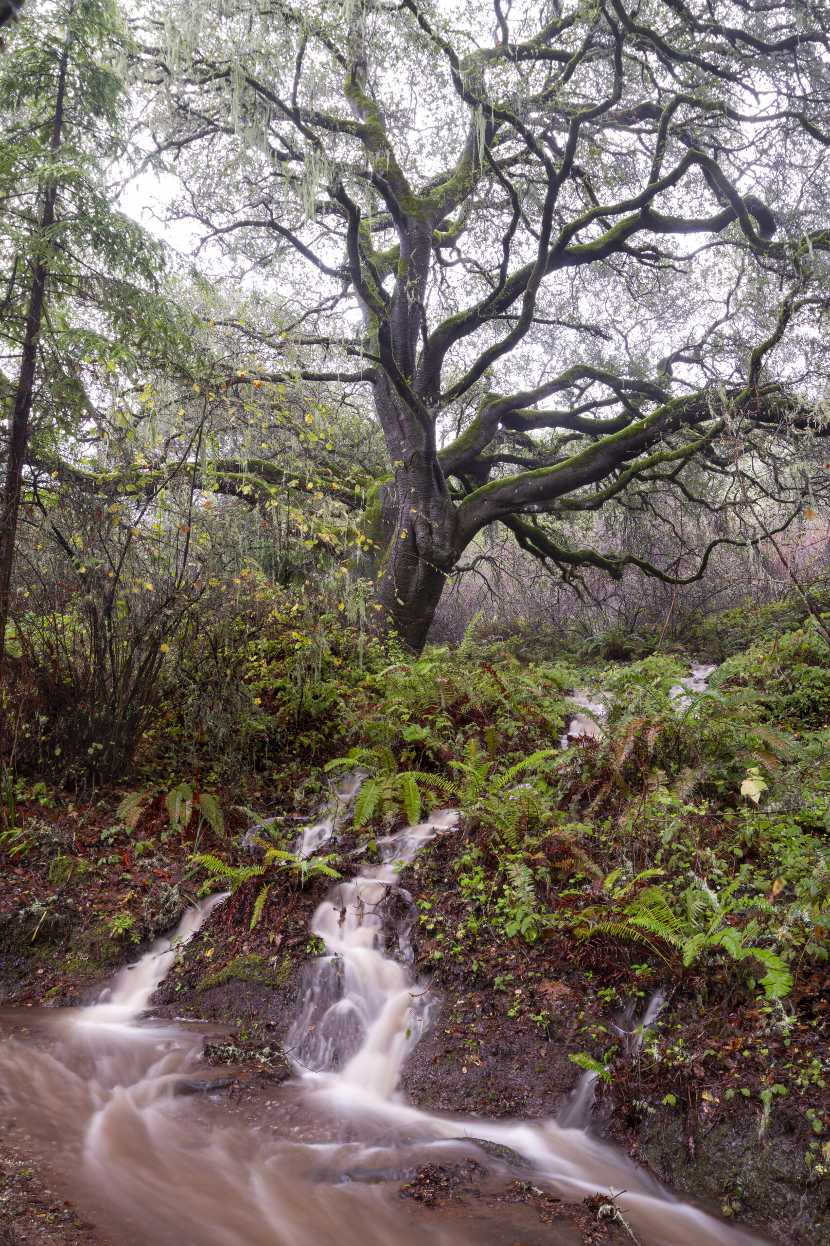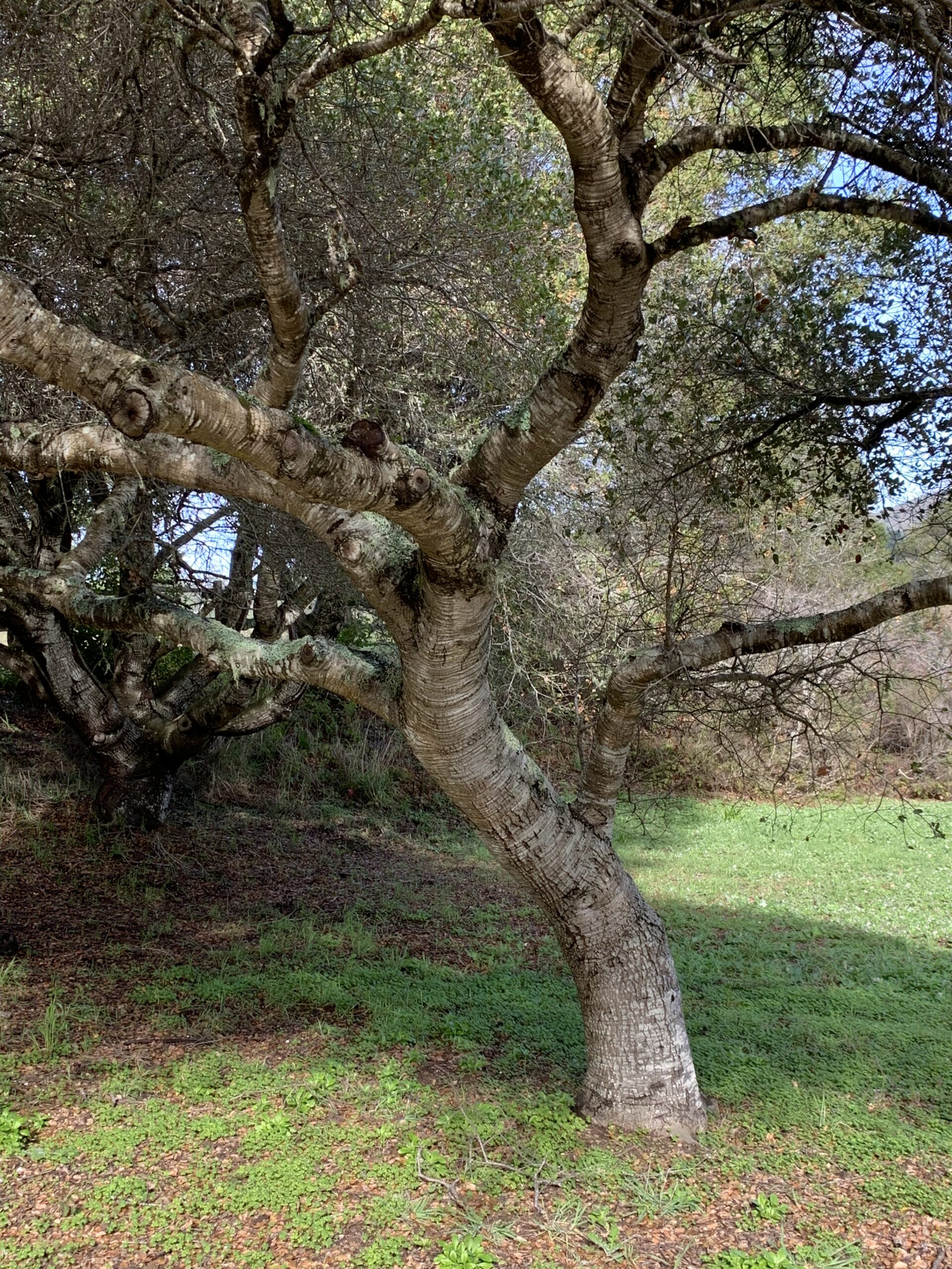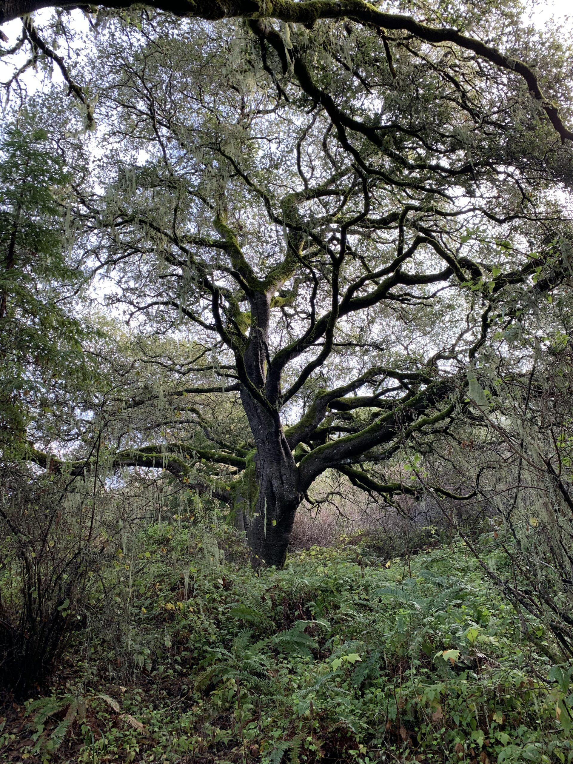 Evergreen oak with dark green leaves and arching branches . Many leaves have “hairy armpits” or small tufts of hair on the underside of leaves where the central and lateral leaf veins meet. Dominant oak along the immediate central and northern coast, it thrives in our coastal environment.