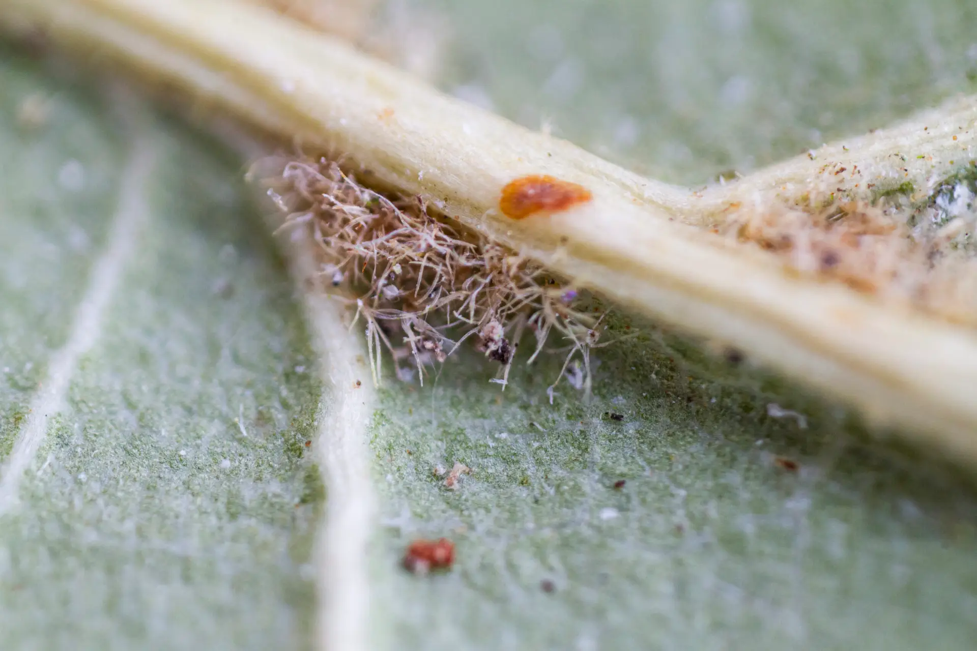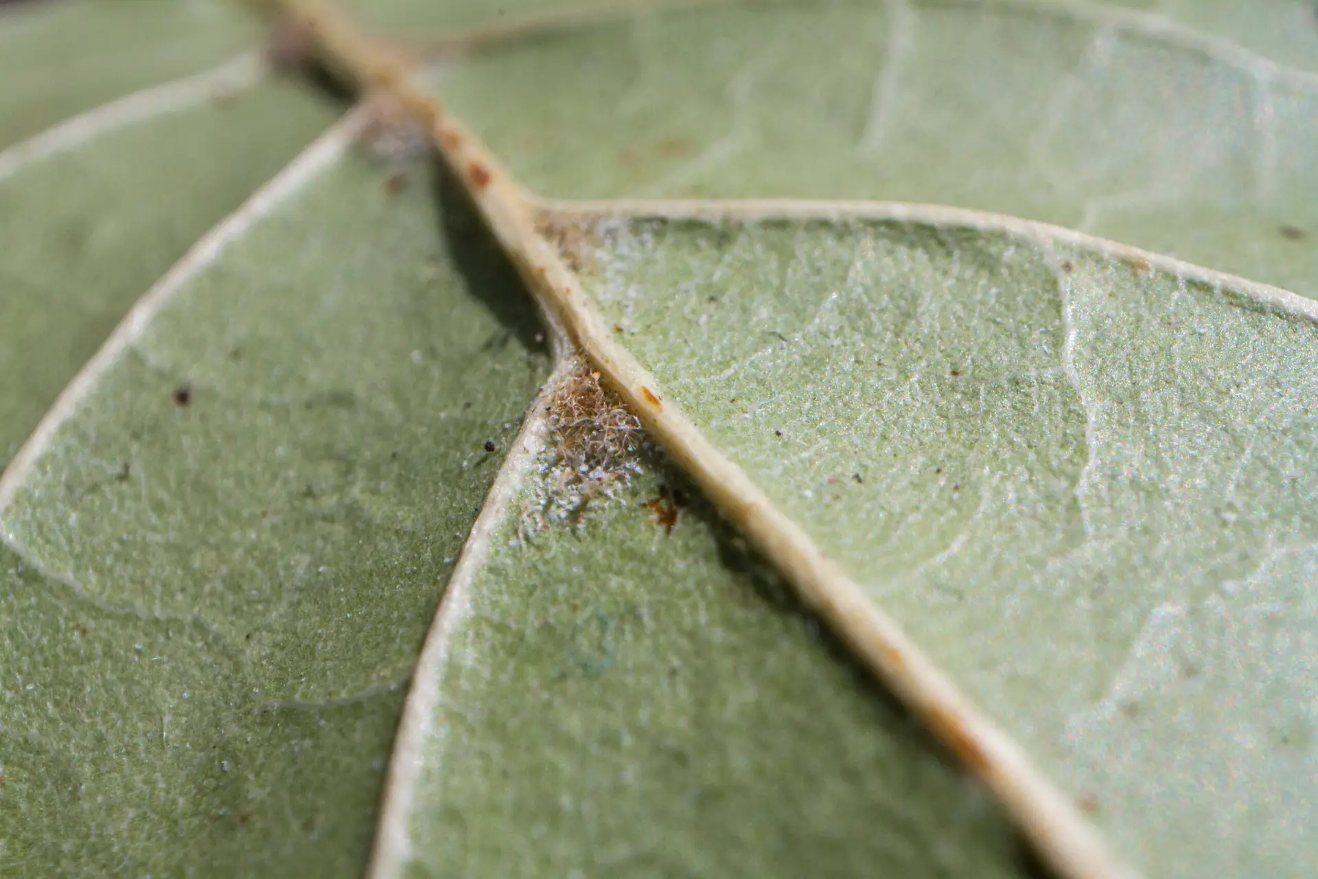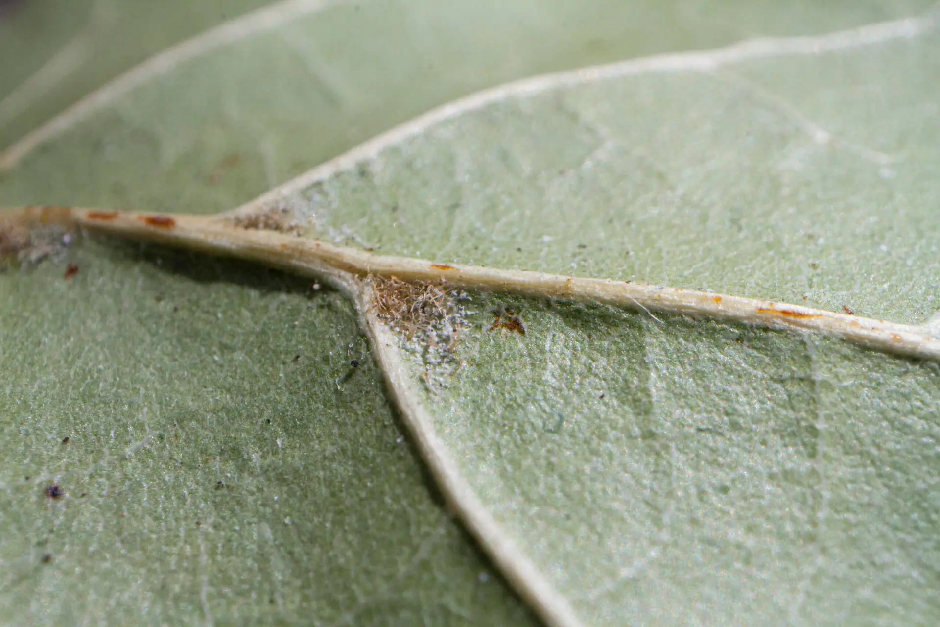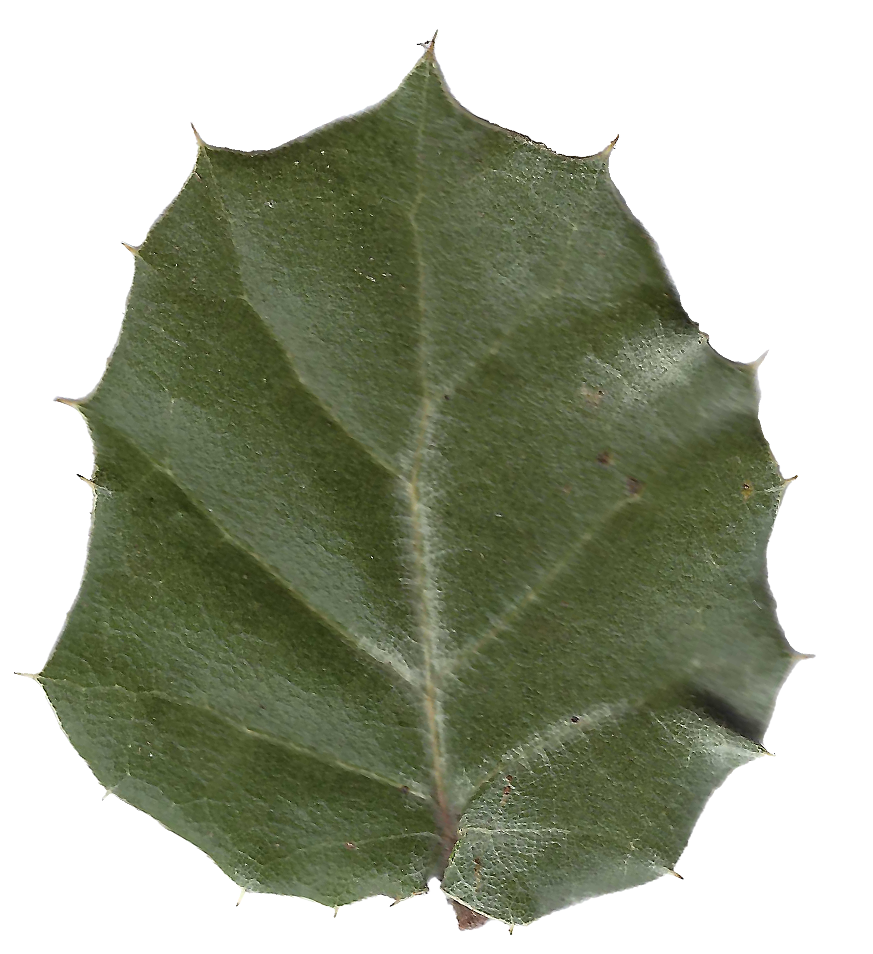 Leathery, dark green, round to widely-ellpitic leaves, often slightly convex and variably revolute (curved under) at the margins, with occasional to sparse spine-toothed margins. Tufts of hair typically occur on the underside of the leaf at central junction of leaf veins.
