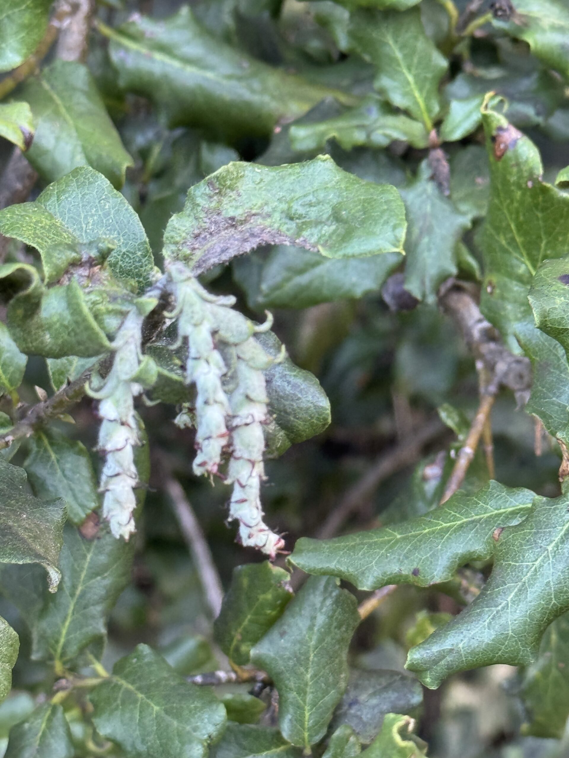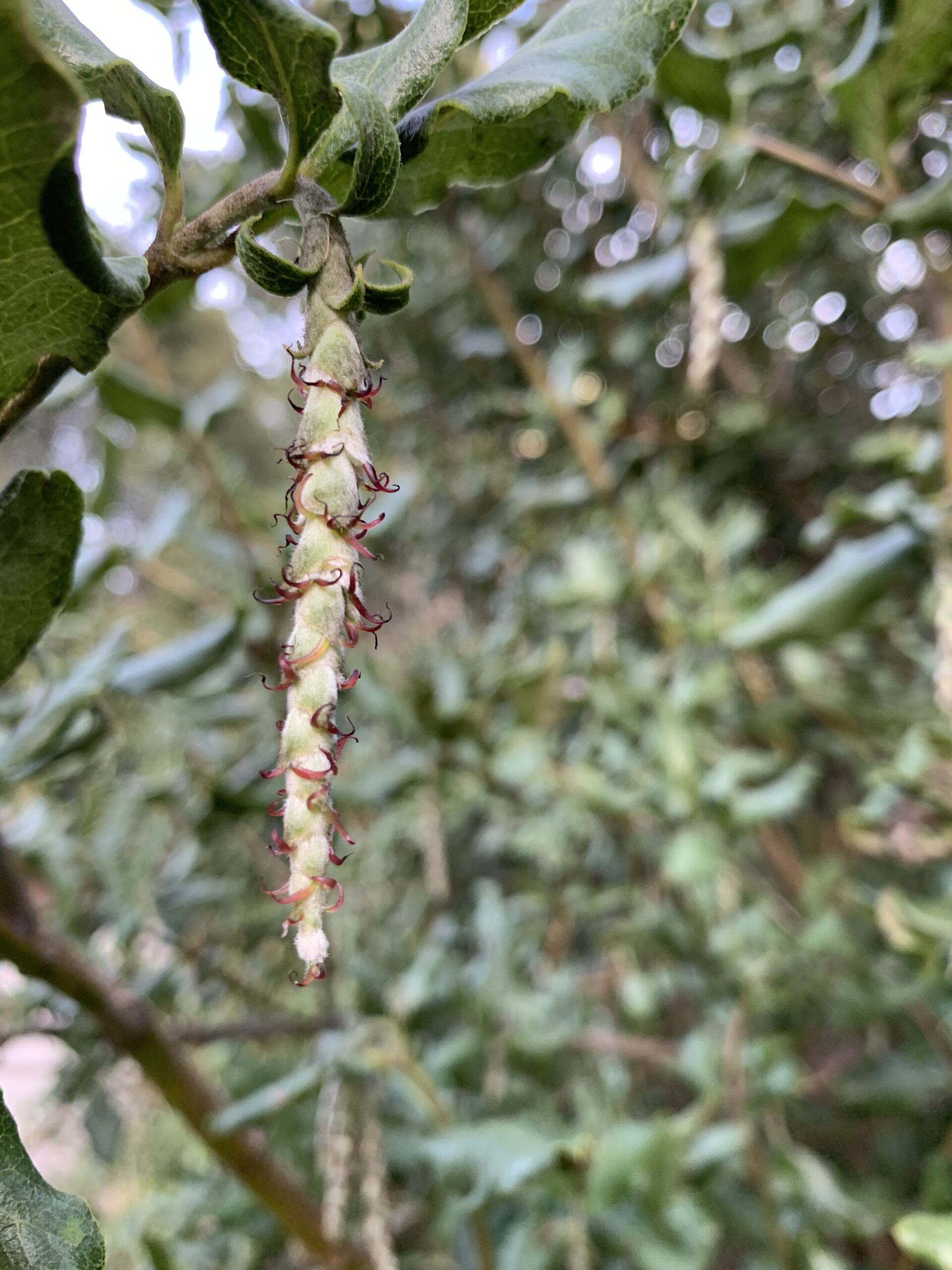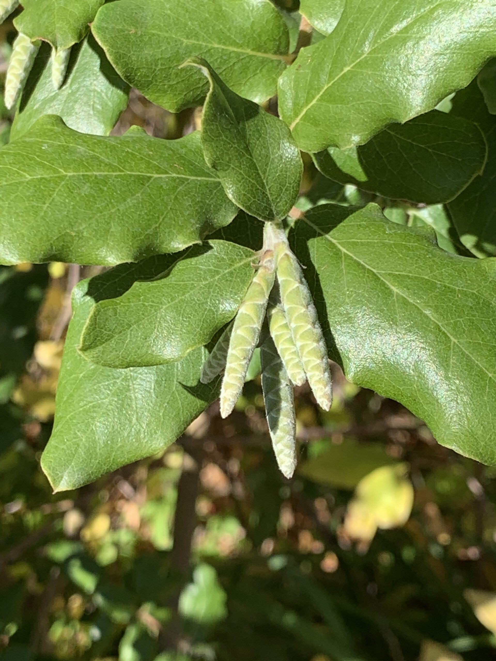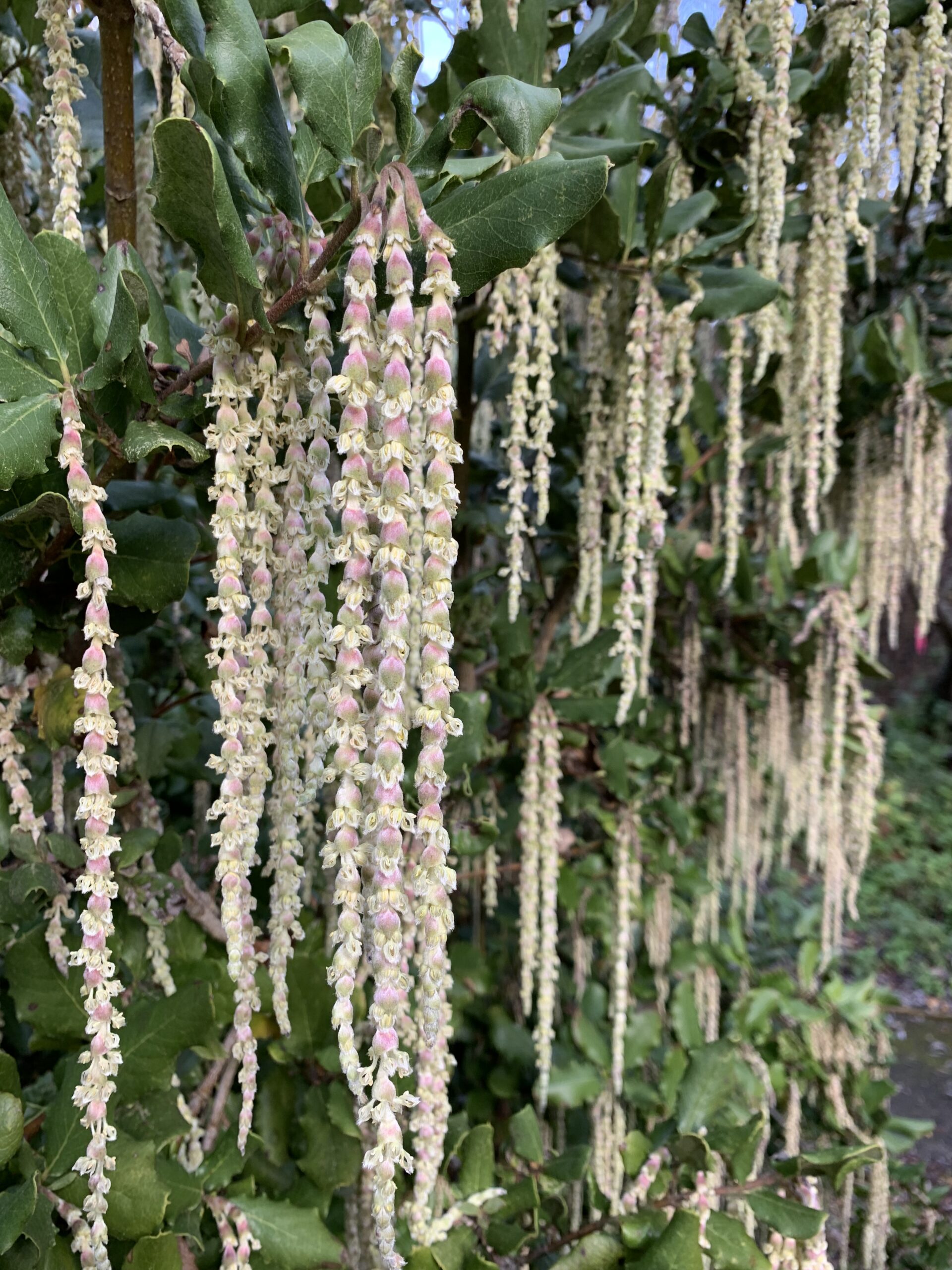 Garrya (Silk Tassel) and Manzanita Arctostaphylos ssp. are often mistaken for one another due to the superficial similarities of their overall stature and sclerophyllous (hard, leathery and evergreen) leaves. The easiest way to tell them apart is that leaves are opposite in Garrya and alternate in Arctostaphylos. Also, Garrya has wavy leaf margins that are often revolute (rolled under) and inflorescences that are catkins.