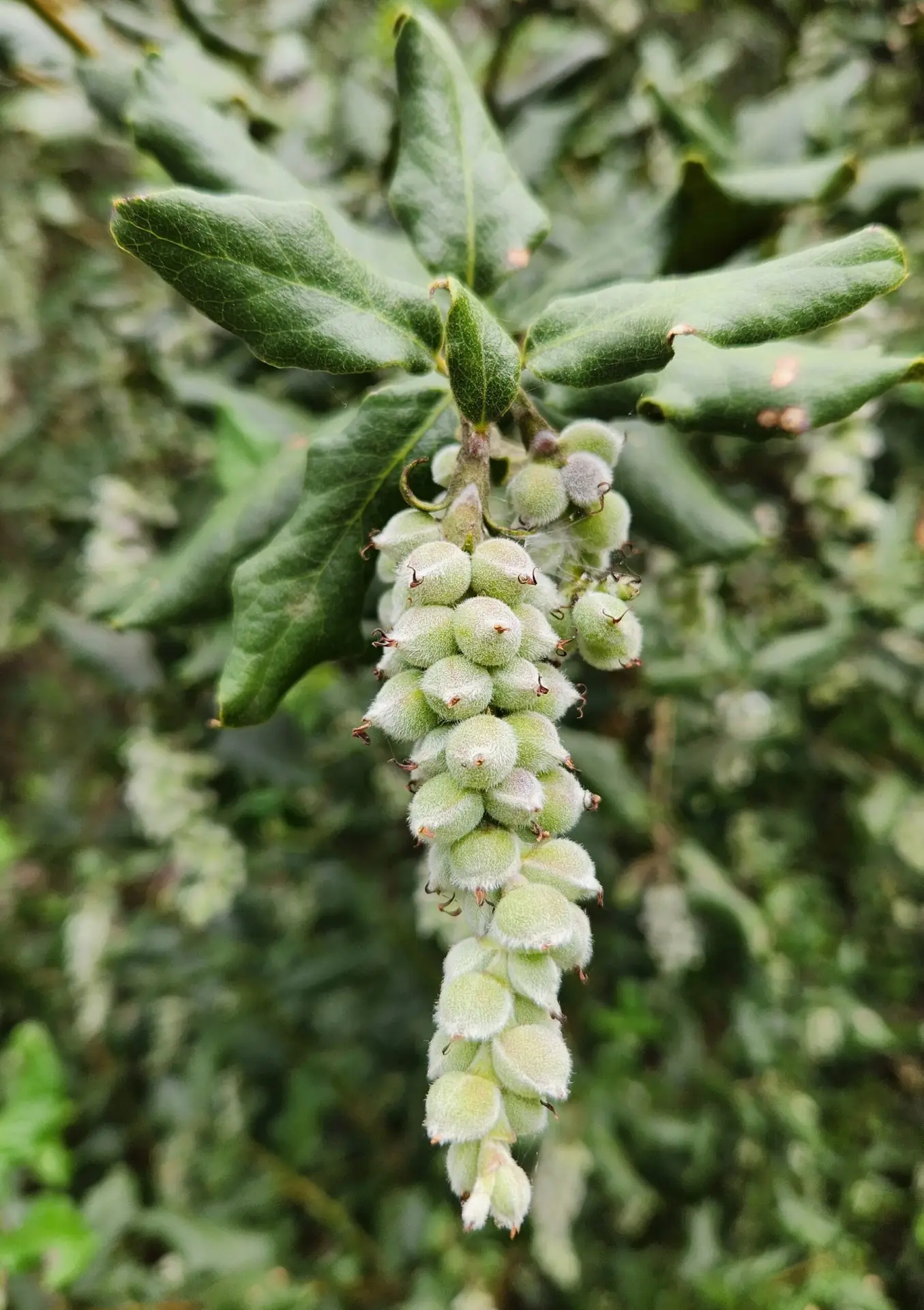 A large, evergreen shrub with dark green leaves and chains of flowers that hang down like tassels.