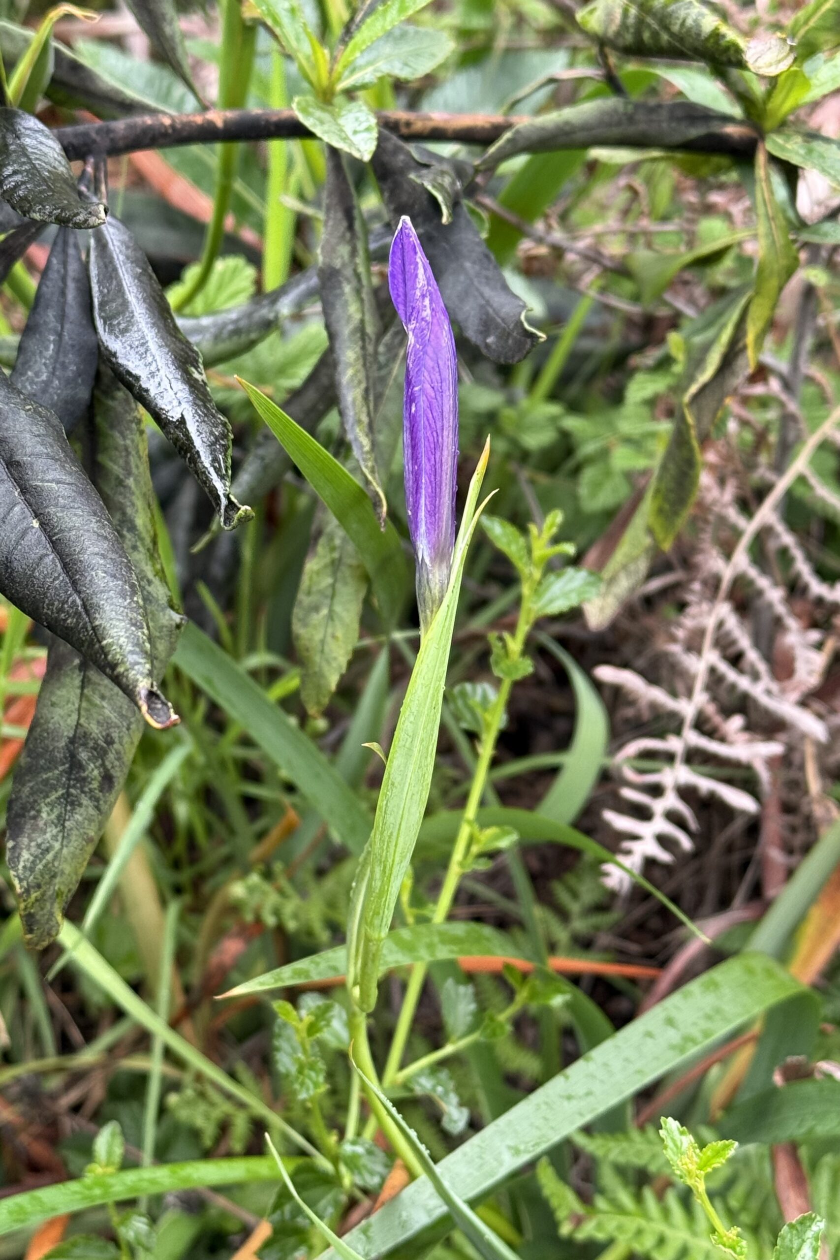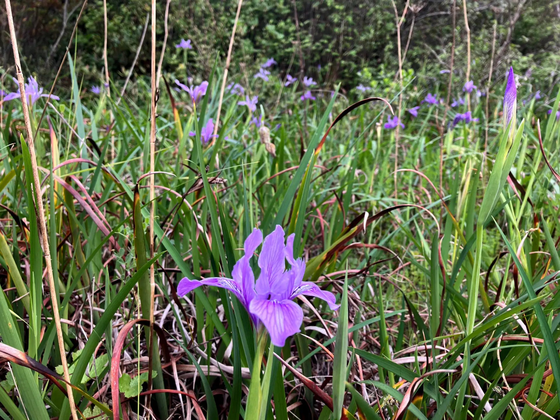 The flower stem grows 12 to 20 inches tall. Clumps of iris can be 2 to 4 feet wide. Iris douglasiana can spread vigorously via rhizomes (asexual/clonal reproduction), resulting in often dense “clumps” of plants in localized areas.