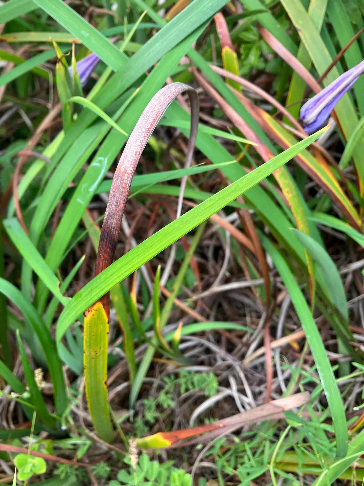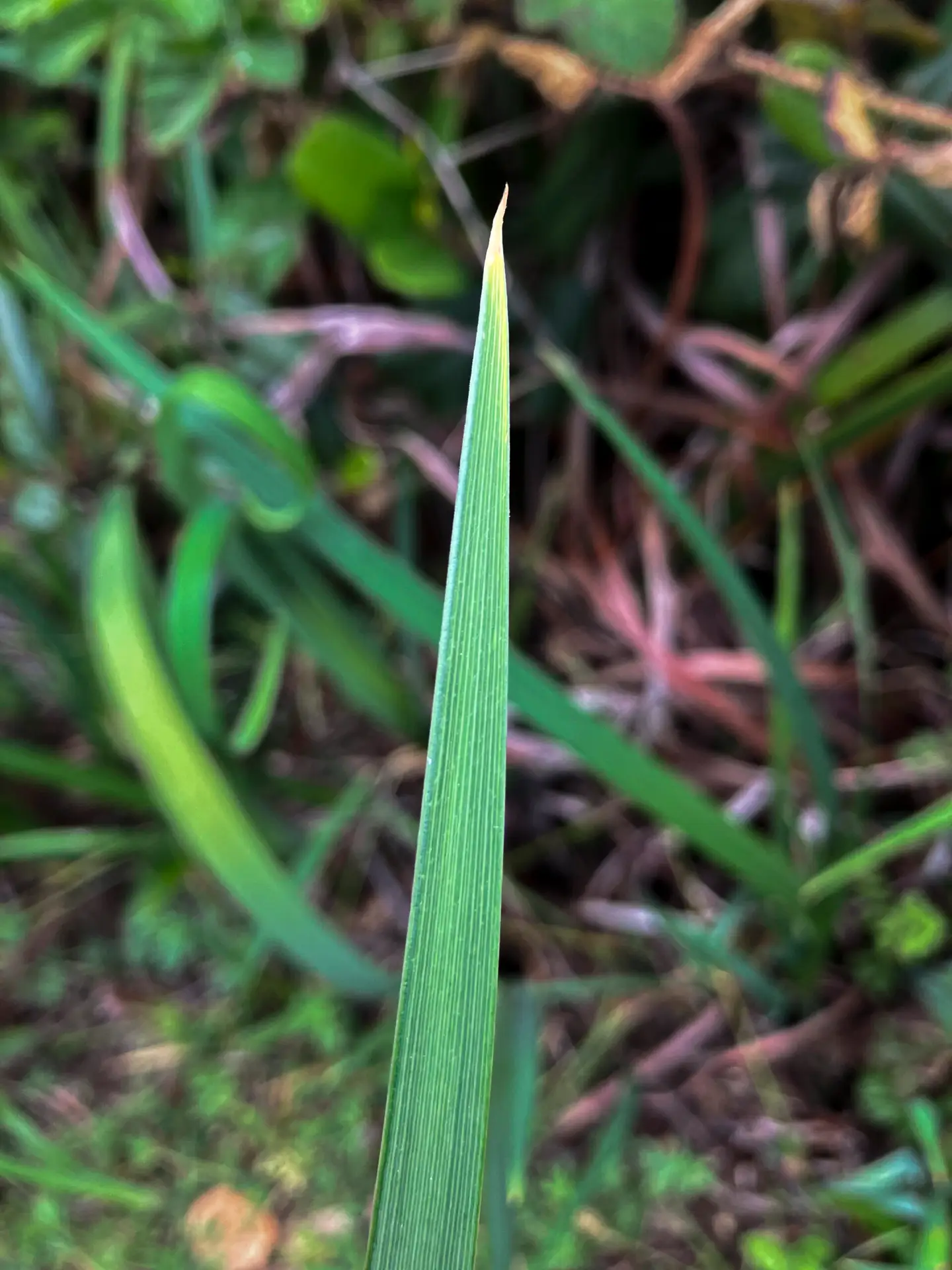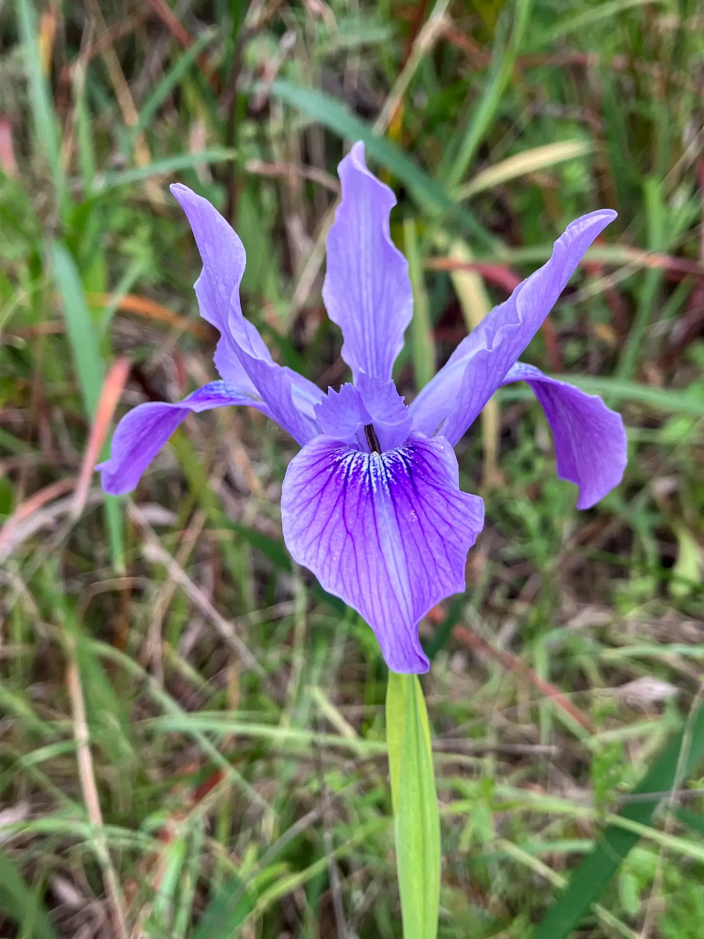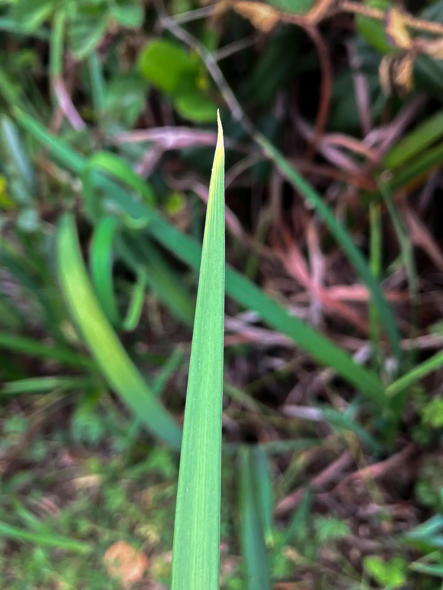 The plant has long, narrow green leaves with parallel veins. The underside of each leaf is paler than the top side. The similar Ground Iris (not in the park) has the same color on both sides of the leaf.