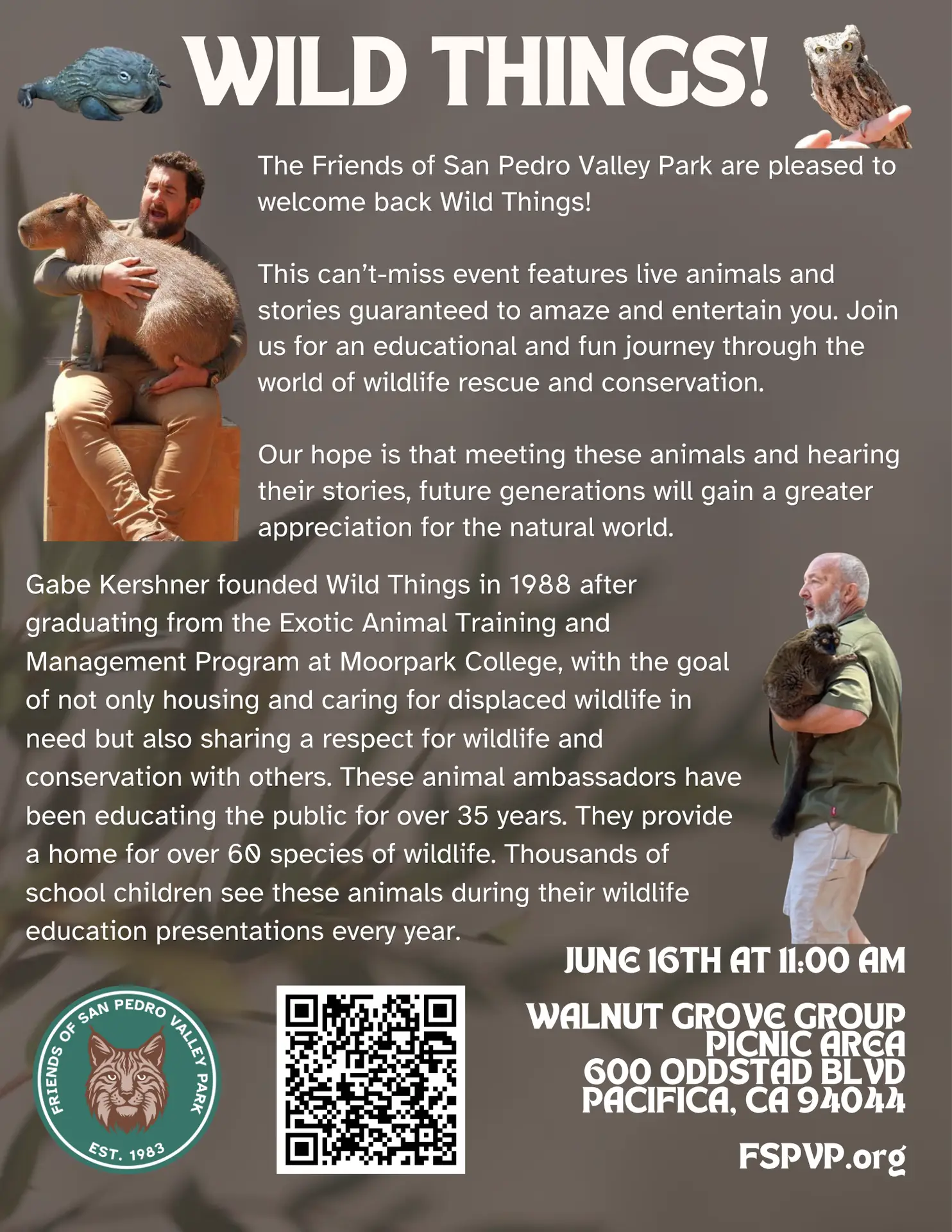 San Pedro Valley Park North Walnut Picnic Area 600 Oddstad Blvd, Pacifica, United StatesThe Friends of San Pedro Valley Park are pleased to welcome back Wild Things! This can’t-miss event features live animals and stories guaranteed to amaze and entertain you. Our hope […]