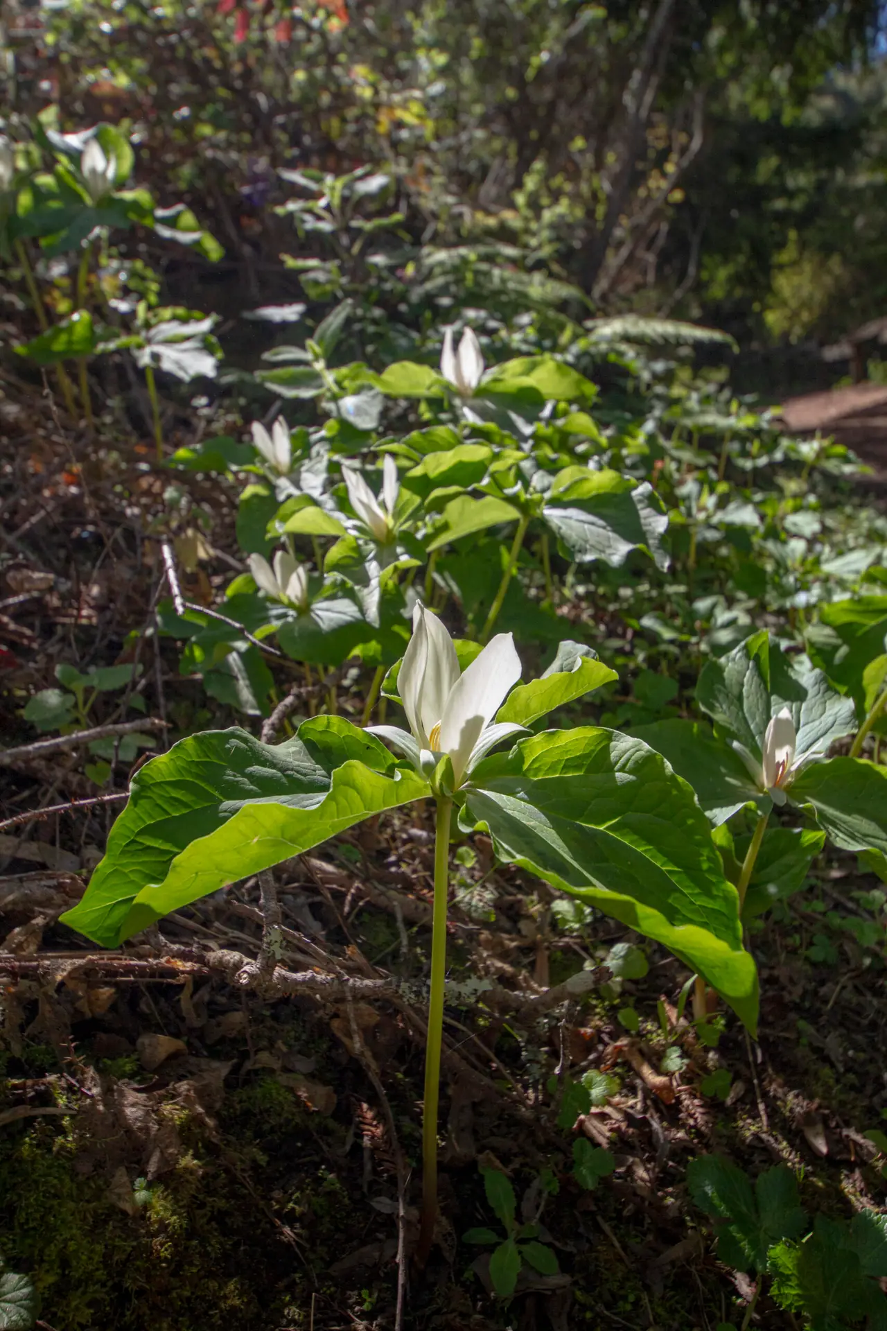 Trilliums have an interesting life cycle that includes a cotyledon (a seed leaf or embryonic leaf) stage, a one leaf stage, a juvenile three leaf stage, a mature three leaf stage, and sometimes three leaf regressive stage with no flower. It takes a plant a minumum of seven years and up to 18 years to reach the flowering or mature stage. Because it takes so long to mature, it is best to never pick a trillium.
