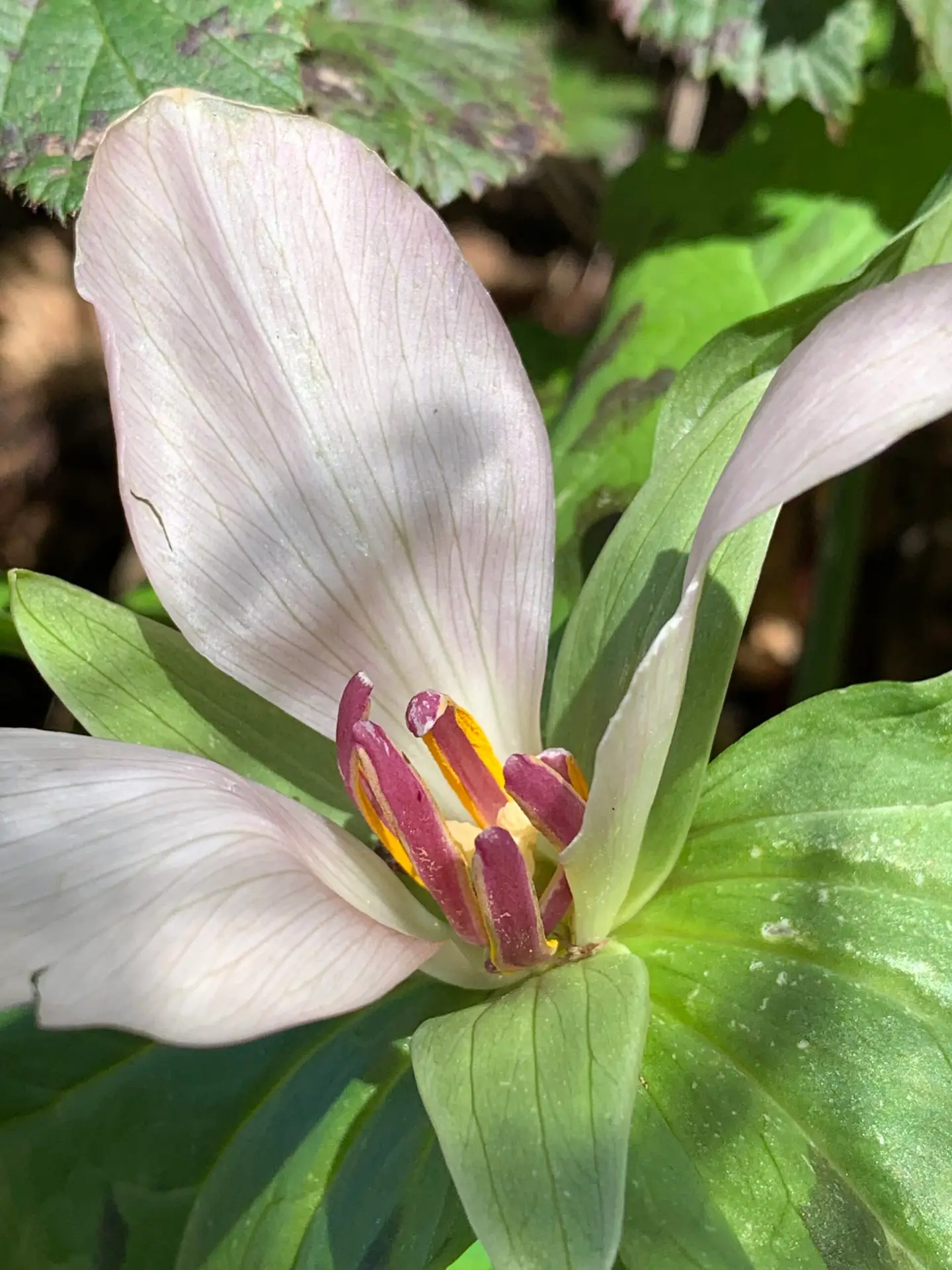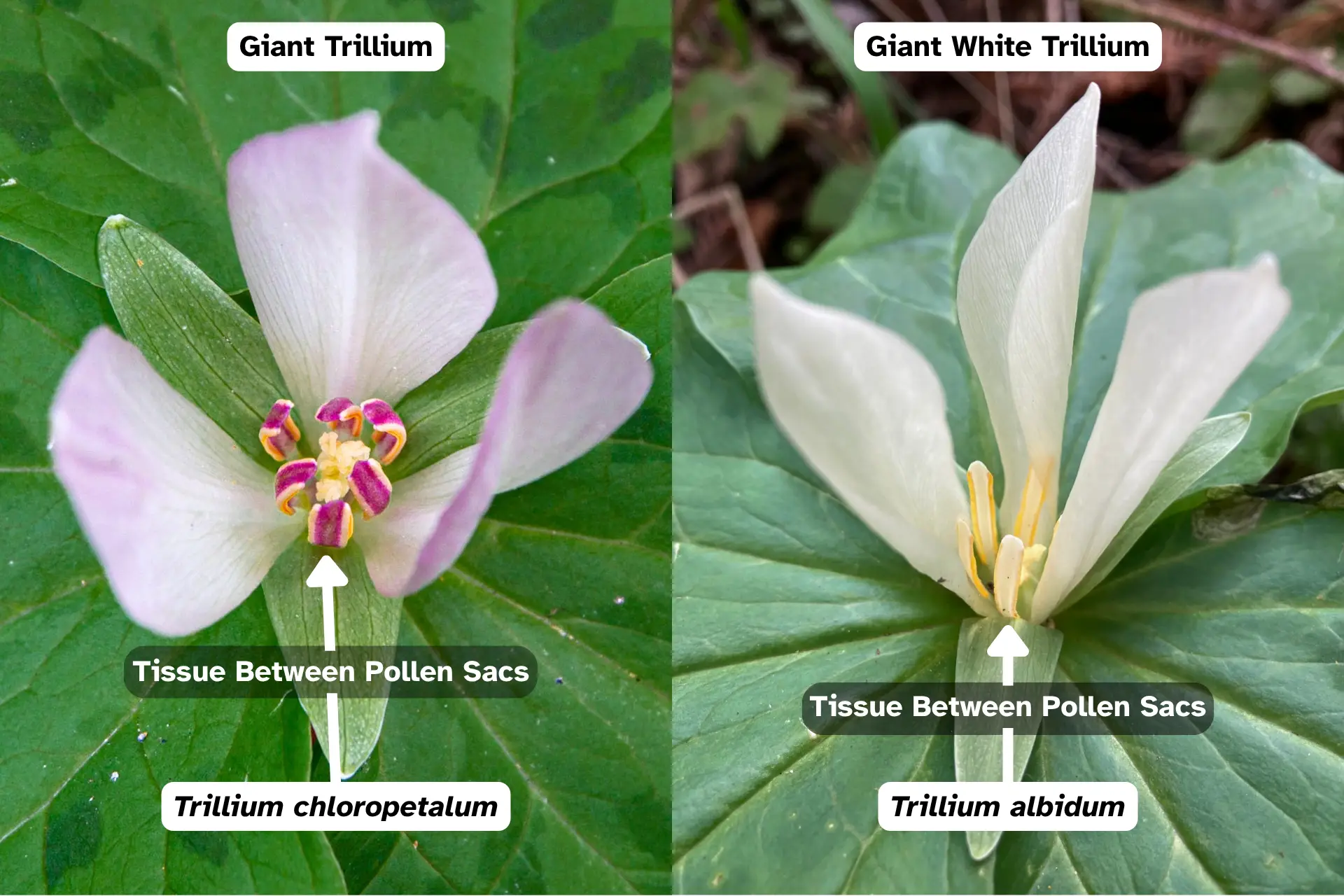 Early spring flowering plant with three large pointed leaves that arise from underground rhizomes, three sepals (subtend the petals of a flower), and three petals. Flower is sessile (has no stalk or peduncle) and attaches directly to the stem. Tissue between pollen sacs (anthers sacs) is purple to light purple, which distinguishes it from Giant White Trillium where the tissue is not purple.