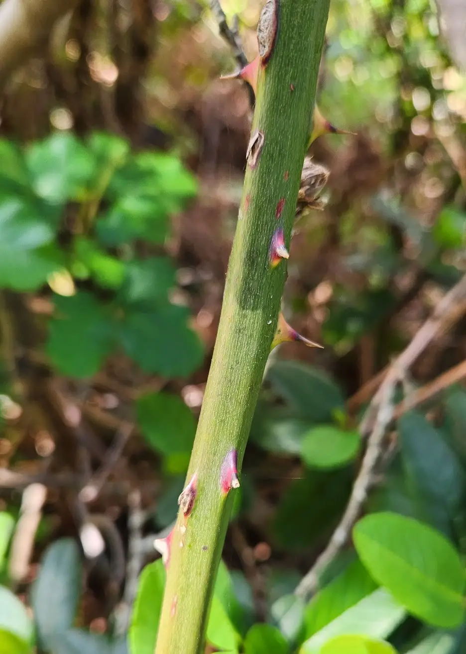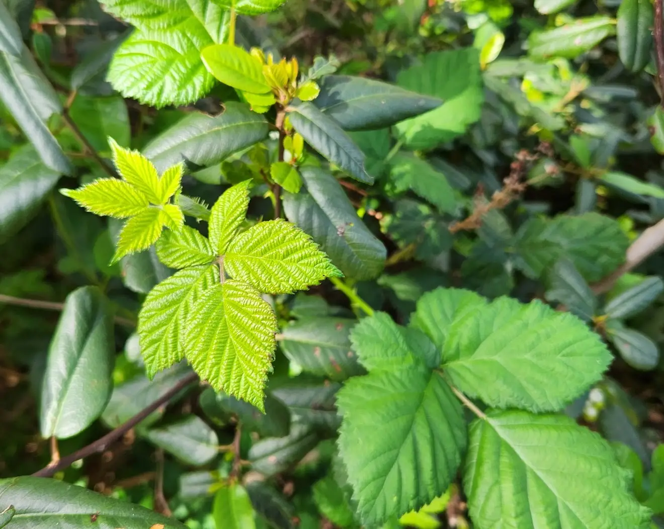 Compound leaves with five leaflets the first year and three leaflets on second year side branches. Dark green above and pale below. Leaflet margin is toothed with snaring, hooked thorns along the underside of the midrib. Leaves are also sometimes red.
