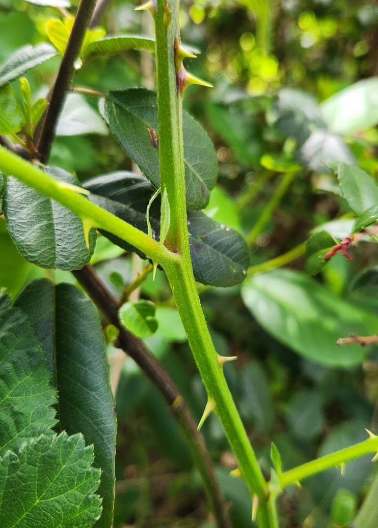 Highly invasive plant produces an impenetrable tangle of five sided, angled stems that can turn red or purple. Stems are .8 -1.0 inch across and have large, stout prickles (up to 1/2 inch long) that are wider at the base and spaced apart, similar in look to small rose thorns. Leaves of 3 to 5 leaflets in groups of 3 with prickles are a lighter shade of green underneath. Flowers are white to pink.