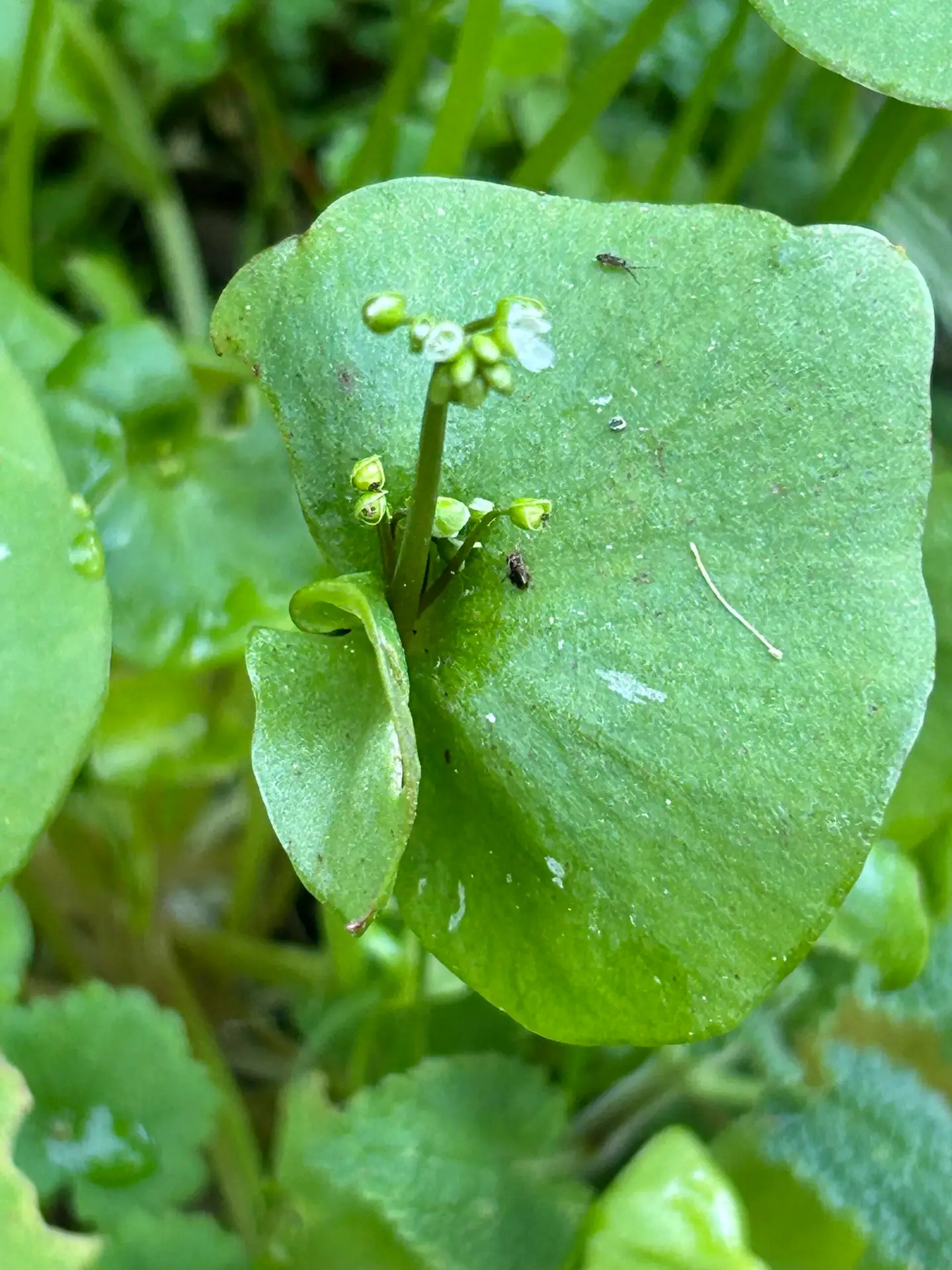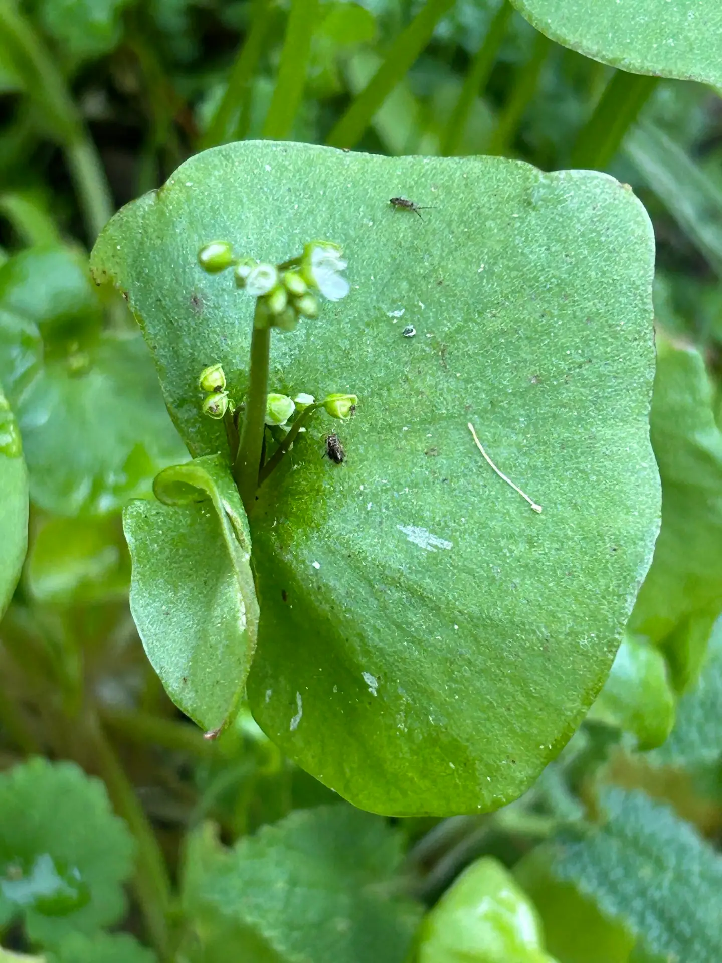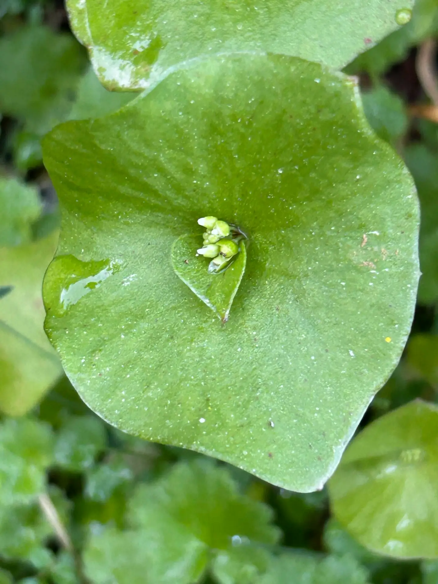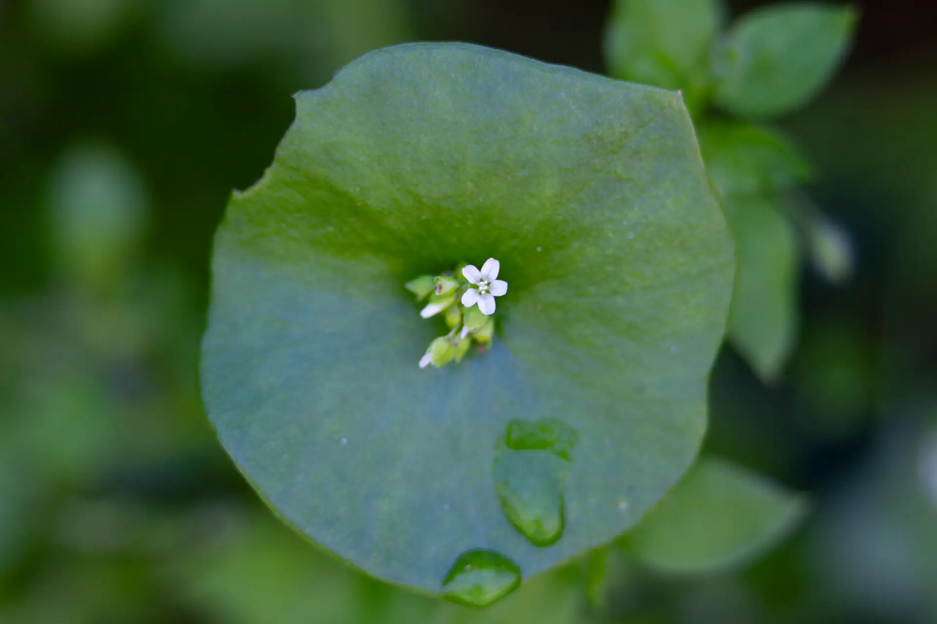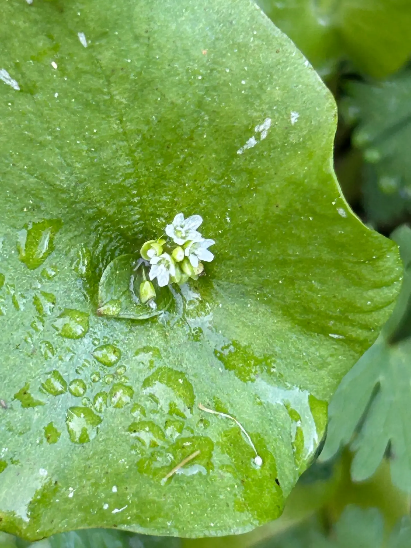 A cluster of up to 40 small (1/4-1/2 inch) white flowers emerge from the center of a saucer-like leaf that surrounds the stem. The flowers have 5 white petals with 5 pinkish stamens. The petals are sometimes tinged with pink markings.