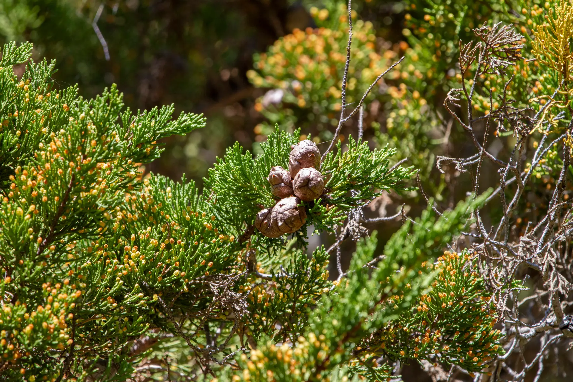 Conifers do not have flowers. Pollen is yellow and released from tiny male pollen cones at the tips of branches.