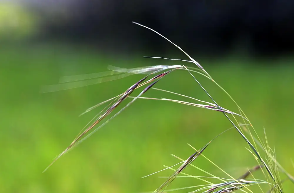 Awn is twice bent (bigeniculate) sometimes refered to as a “knee”. The knee is formed due to a reverse twist in the awn. This means the awns of purple needle grass change direction twice.