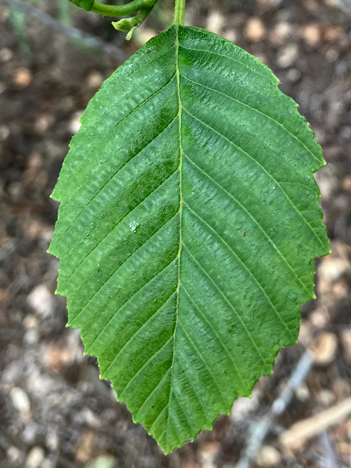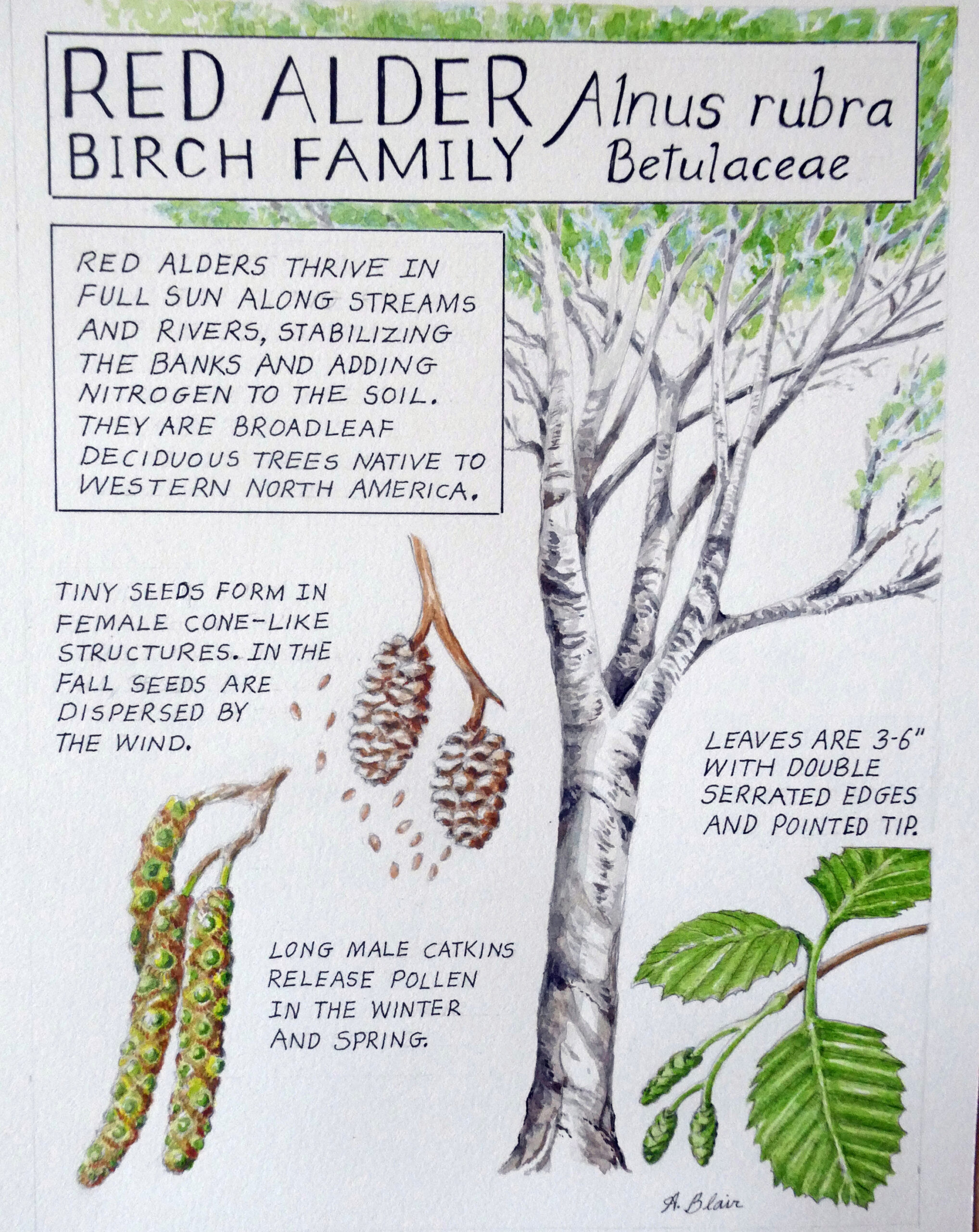 Broadleaf deciduous tree that thrives in full sun along steams and rivers. Red alder has simple, alternate leaves and distinctive catkins in the spring.